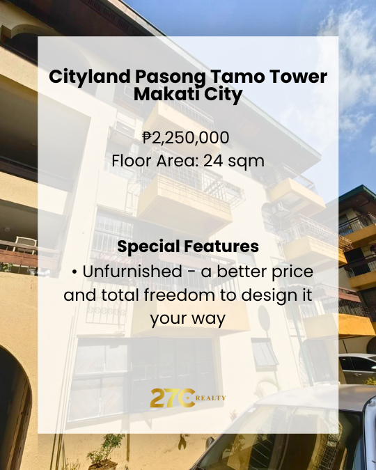 This 24 sqm studio unit at Cityland Pasong Tamo offers a smart Makati address just minutes from work, cafés, and daily essentials—perfect as a starter home or investment.